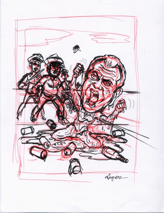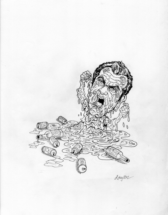 Original ink drawing and thumbnail sketch both on 8.5 X 11 copy paper used in the process to create a card for 2007 Hollywood Zombies trading card series by Topps. (Hollywood Zombies trading card is not included with the original art.)