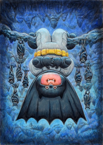 Original detailed acrylic painting color rough of 2018 Topps GARBAGE PAIL KIDS: We Hate The ‘80s (Movies Subset) #1 Batty MANNY / Bonkers BRUCE by award winning artist LAYRON DeJARNETTE (Official Garbage Pail Kids artist for Topps, Artist for Disney, Warner Bros., Marvel, DC Comics, Mattel, Monster High, Upper Deck & Cryptozoic Entertainment).