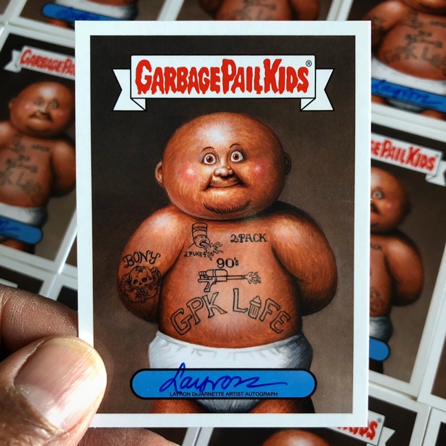 Original final acrylic painting of 2019 Topps GARBAGE PAIL KIDS: We Hate The ‘90s (Music & Celebrities Sticker) #6 DOUG Life / Tattoo LOU by award winning artist LAYRON DeJARNETTE (Official Garbage Pail Kids artist for Topps, Artist for Disney, Warner Bros., Marvel, DC Comics, Mattel, Monster High, Upper Deck & Cryptozoic Entertainment.)